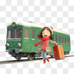 3D插画年轻女孩拉着行李箱走在下雪的绿色火车旁免抠元素