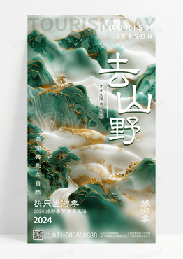 绿色3D立体琉璃质感国潮山水风景插画旅游手机宣传海报