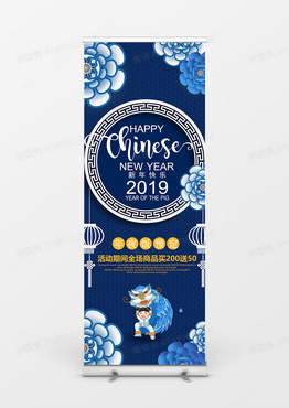 蓝色中国传统青花吉祥淡雅年夜饭新年展架