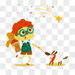 手绘卡通女孩遛狗免抠元素