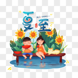 手绘立夏场景男孩女孩坐着吃西瓜元素