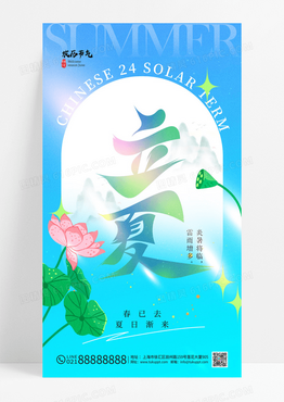 蓝色立夏24节气字体荷花简约海报