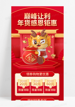 红色简约大气c4d巅峰让利年货感恩钜惠元旦长图