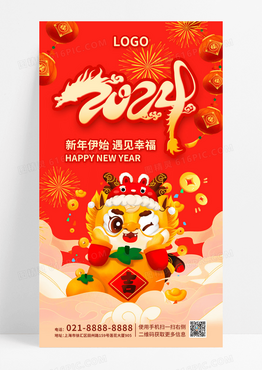红色插画喜庆龙年灯笼2023龙年元旦新年春节手机宣传海报2023龙年新年