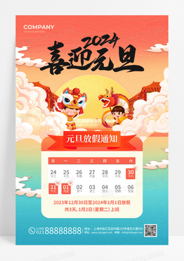 橙色国朝喜迎元旦元旦放假通知手机文案海报2024元旦新年