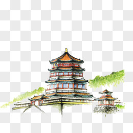 水彩手绘风格中式古典亭台楼阁免抠元素