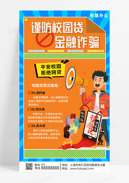 蓝绿橙撞色系卡通谨防校园贷创意宣传海报