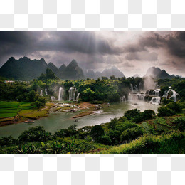 乌云下的绿色草地河流