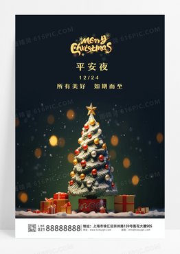 绿色深色简约草莓蜡烛灯光意境创意圣诞节平安夜海报设计