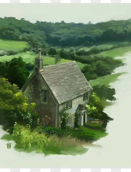绿色树木丛生小木屋海报背景