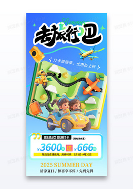 蓝色卡通插画夏日旅行大巴行李箱骑行出行季旅游季宣传海报