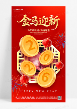 红色创意金马迎新3d金币烟花马年新年元旦海报