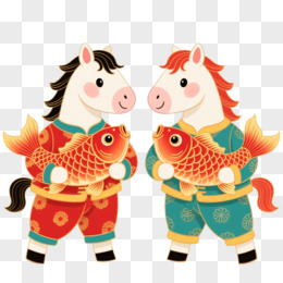 国潮插画一对小马抱着红鲤鱼免抠元素
