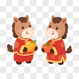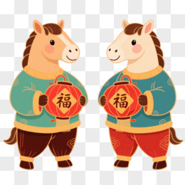 卡通一对小马拿着对联戴着舞狮帽免抠元素