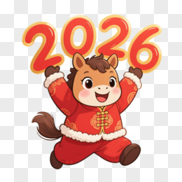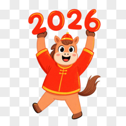 卡通穿着金红色衣服的小马举着2026免抠元素
