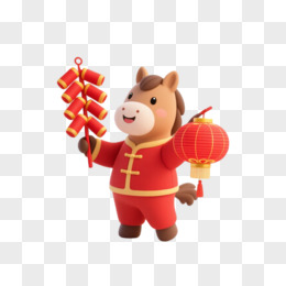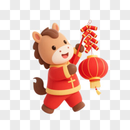 卡通一个小马拿着灯笼和鞭炮免抠元素