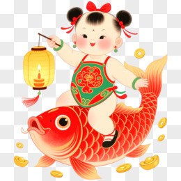 国潮插画一对小马抱着红鲤鱼免抠元素