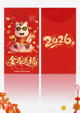 潮流卡通红金色喜庆2026马年新年物料红包设计