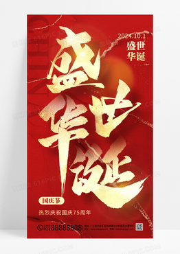 红色国庆节祝福毛笔大字红金色创意手机海报