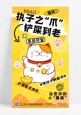 黄色插画执子之爪铲屎到老猫咪宠物手机宣传海报