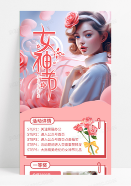 粉红浪漫玫瑰插画风38妇女节女神节长图手机长图38妇女节三八妇女节