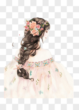 手绘卡通拿花回头女孩元素