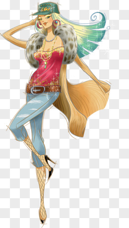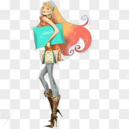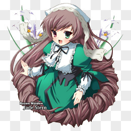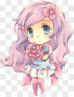 卡通风格中长发穿着粉绿色条纹吊带长裙的美女在粉色的花丛中闻花香免抠元素