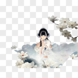 工笔淡彩画风宋代古风汉服美女粉色和白色牡丹闻花香免抠元素