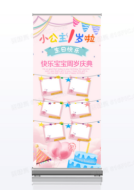 粉色梦幻卡通宝宝周岁宴易拉宝X展架背景周岁生日易拉宝