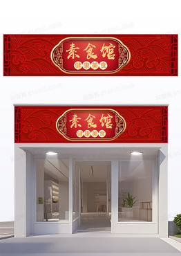 红色大气国风创意素食馆餐饮门头设计