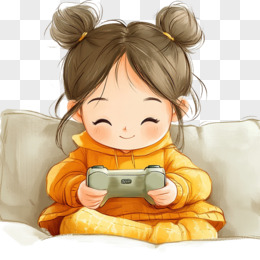 卡通风格床上玩游戏的可爱女孩免抠元素