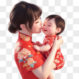 3D卡通床红色短袖旗袍的母亲抱着婴儿免抠元素