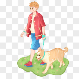 手绘男生遛狗免抠素材