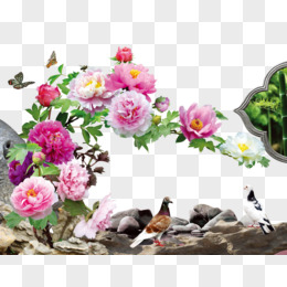 国潮牡丹假山中式建筑手绘免抠元素