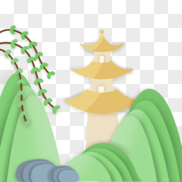 手绘剪纸风高塔青山免抠元素
