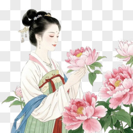 工笔淡彩画风宋代古风汉服美女粉色和白色牡丹闻花香免抠元素
