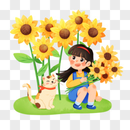 手绘卡通小女孩手捧向日葵和猫一起赏花免抠素材