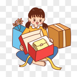 手绘卡通女孩拆快递免抠元素
