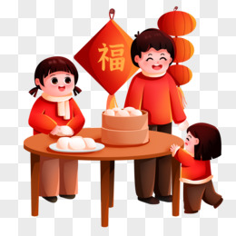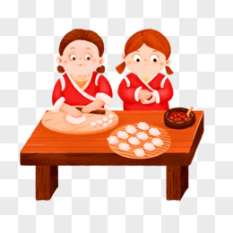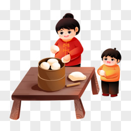 卡通手绘妈妈和孩子一起包饺子素材