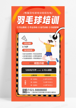羽毛球培训课程教育招生橙色描边风课程招生宣传海报手机海报