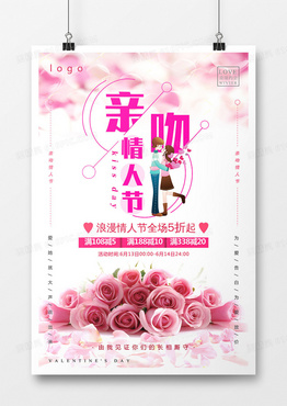 粉色情侣亲吻密集玫瑰花爱唯美简约风亲吻情人节海报
