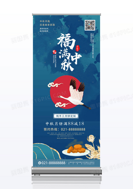 蓝色金色大气中国风国潮太阳仙鹤祥云牡丹地产福满中秋节展架易拉宝