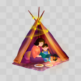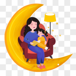 卡通手绘母女睡前阅读亲子阅读场景素材