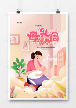温馨手绘卡通母乳母婴世界母乳喂养周海报设计