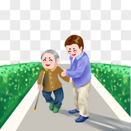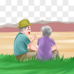 手绘草坪上的爷爷奶奶散步关爱老人元素