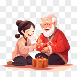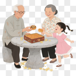 卡通手绘女孩和爷爷奶奶吃月饼免抠元素