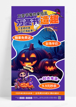 紫色万圣节活动万圣夜南瓜灯秒杀活动海报