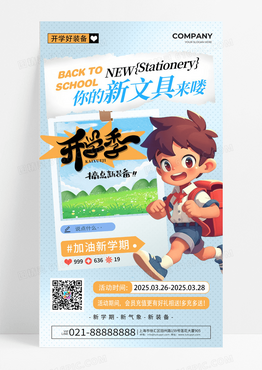 淡蓝色创意开学季新文具促销男孩上学开学季海报