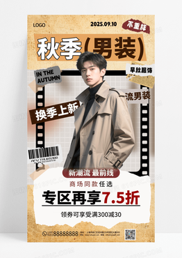 黄色复古风秋季男装上新活动促销海报