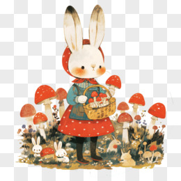 春天拟人动物兔子采摘蘑菇免抠元素